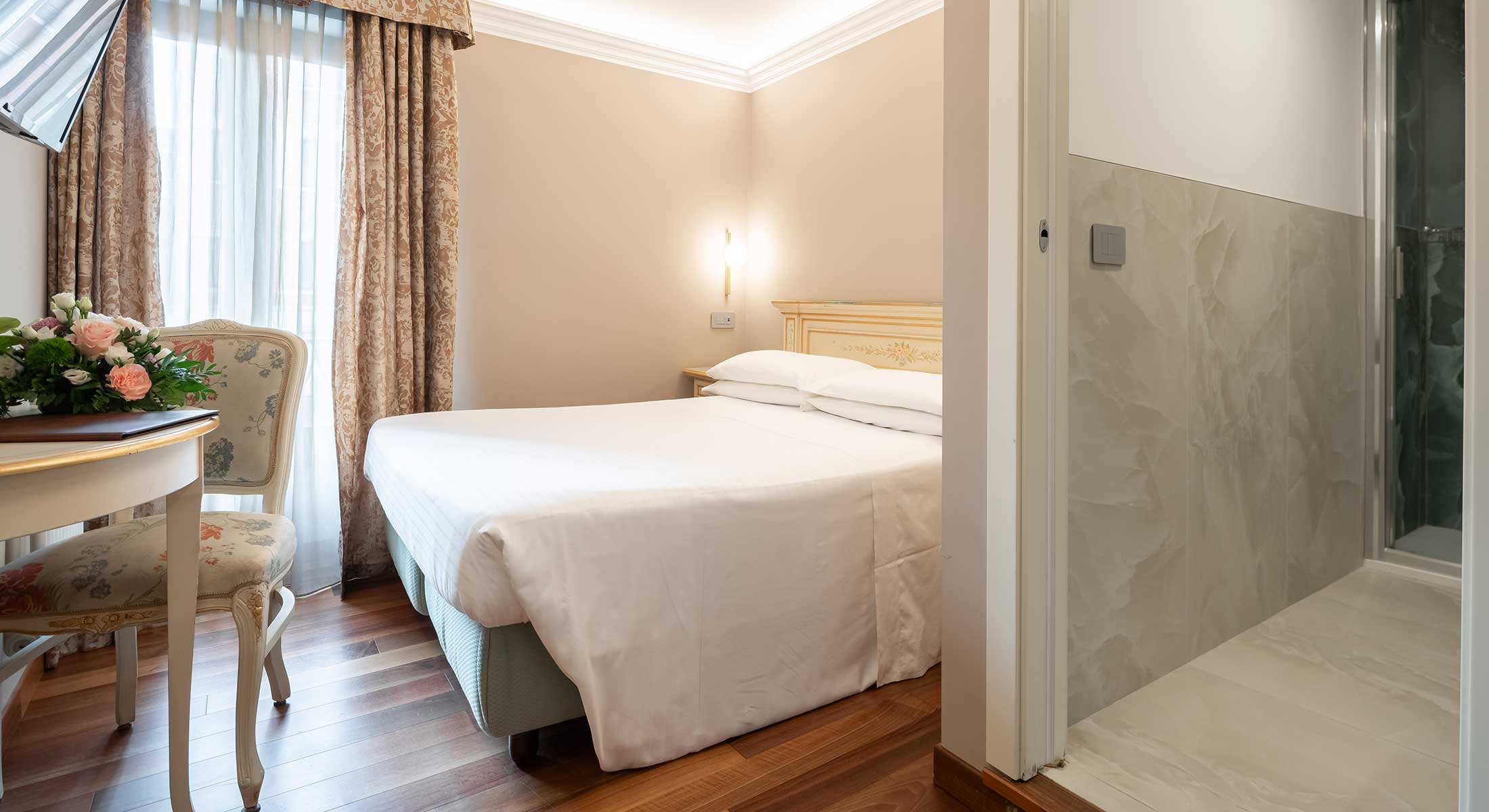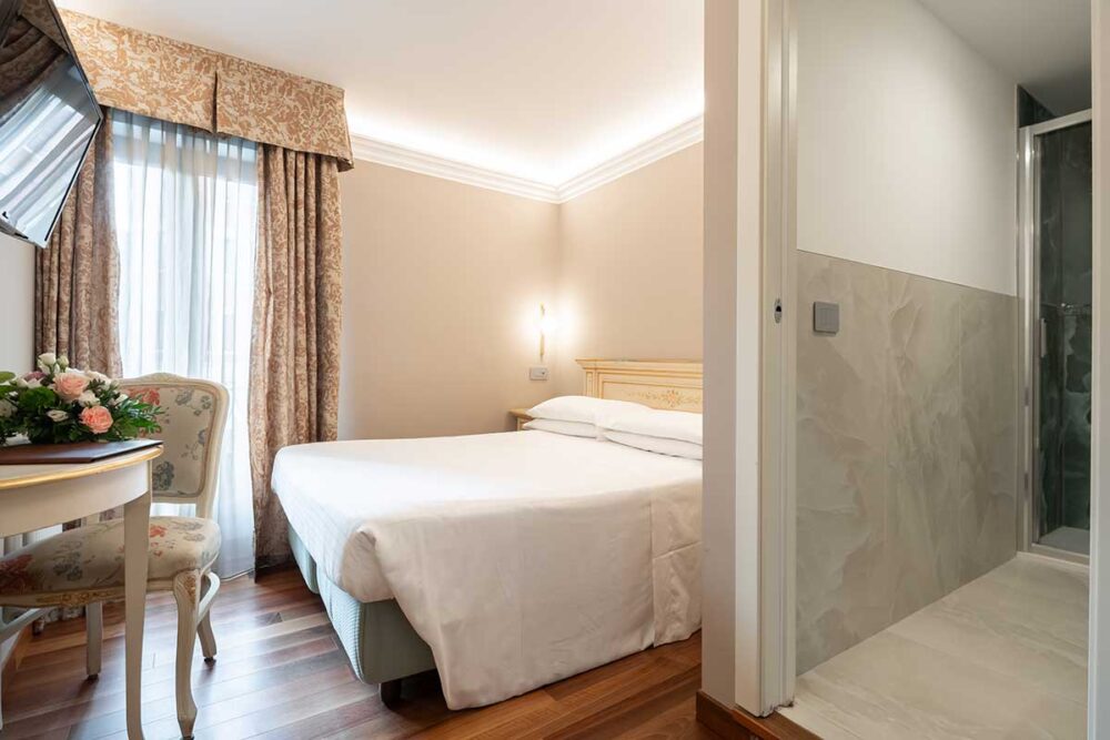 Tutto il fascino della Camera Classica Doppia, ma con il valore aggiunto di un esclusivo affaccio sullo specchio d’acqua del famoso Bacino Orseolo e le sue eleganti gondole.